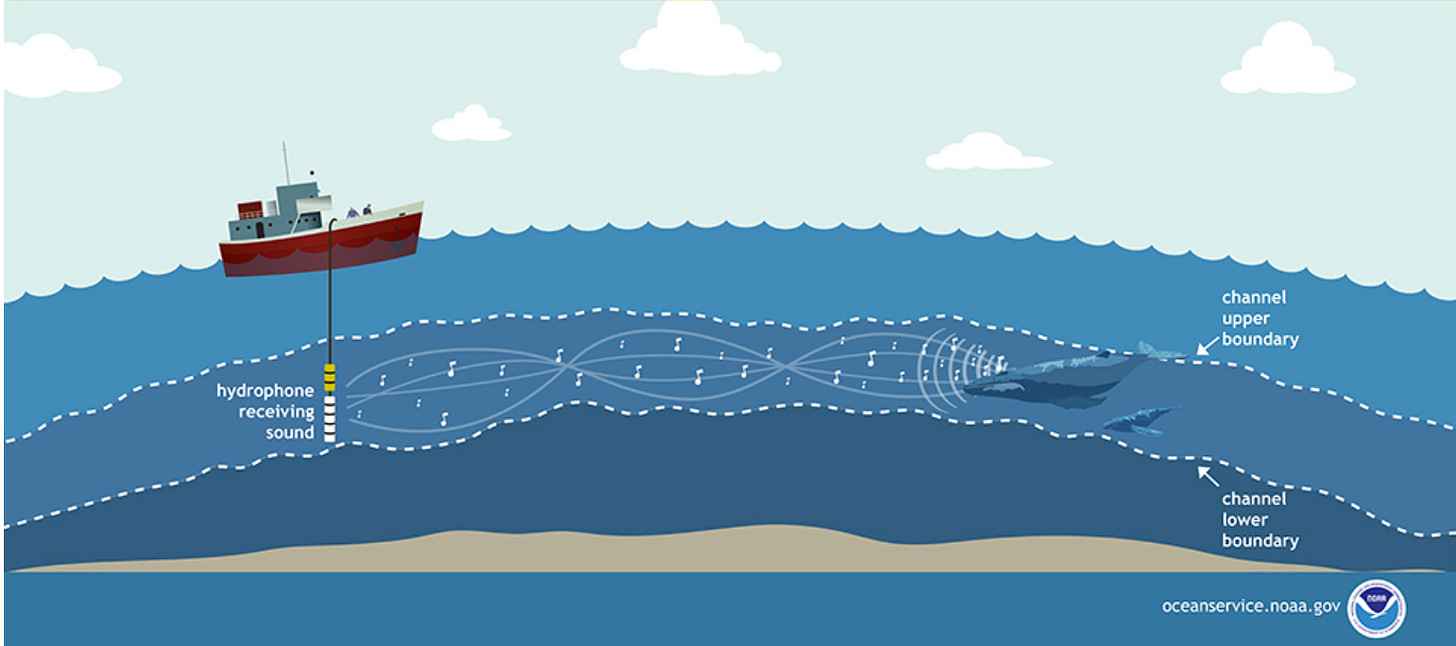 This implies two things. First, that sound waves cannot enter this layer. Only what is made within it can be heard by someone else listening inside it. And second, that sound waves cannot leave: any noise originating within this layer can thus be heard at enormous distances. Whale song is a good example of this: it can travel across an ocean, and allow a creature off the coast of Ireland to communicate with another swimming near Virginia.