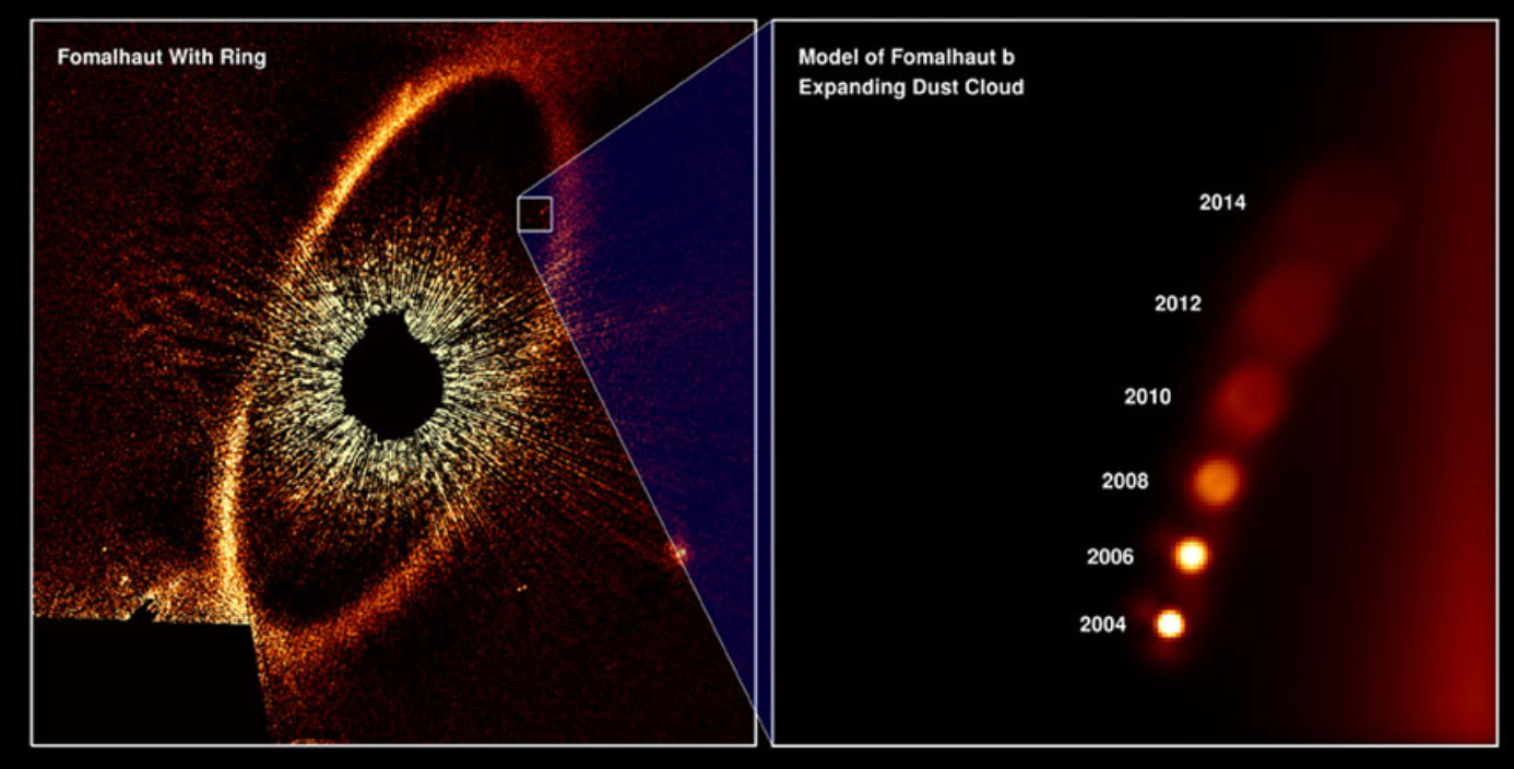 In 2004, headlines were made when Hubble spotted something that looked like a planet in those outer rings. The discovery was hailed as a big success: indeed, it marked one of the first times we thought we had taken direct images of a world around another star. But things soon got weird. In optical wavelengths the object was far brighter than any planet should be, yet when telescopes examined it in infrared wavelengths they failed to spot anything at all.