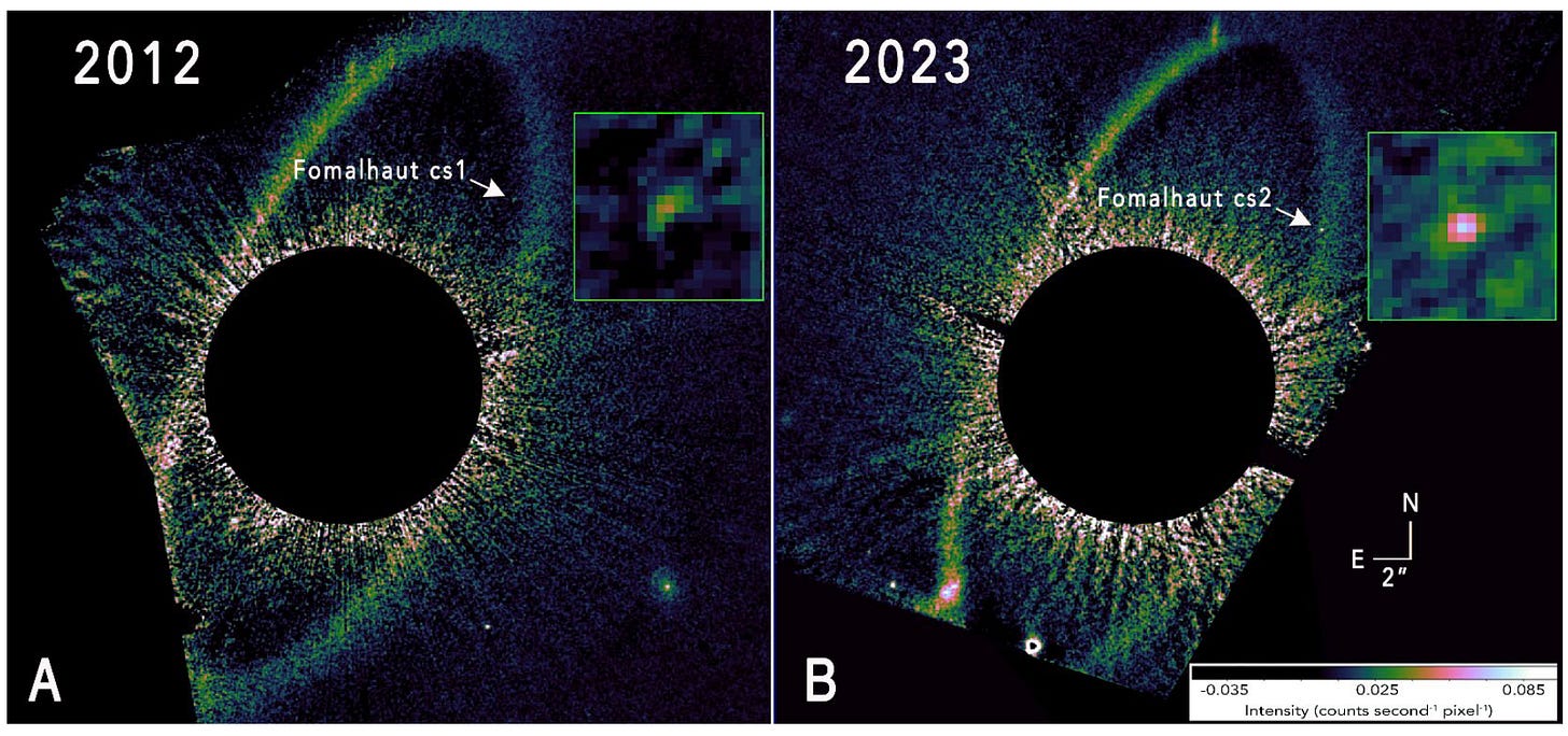 By 2014, the object had vanished altogether, and it has remained elusive ever since. In 2023 astronomers led by Paul Kalas of the University of California searched for it again. Once again they used Hubble, but, as they outlined in a recent paper, they still couldn’t find any clear sign of the dust cloud. Yet as they searched, they did find something else: a new point-like object had appeared around Fomalhaut.